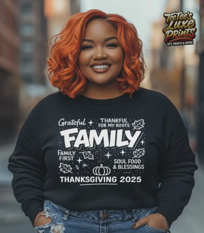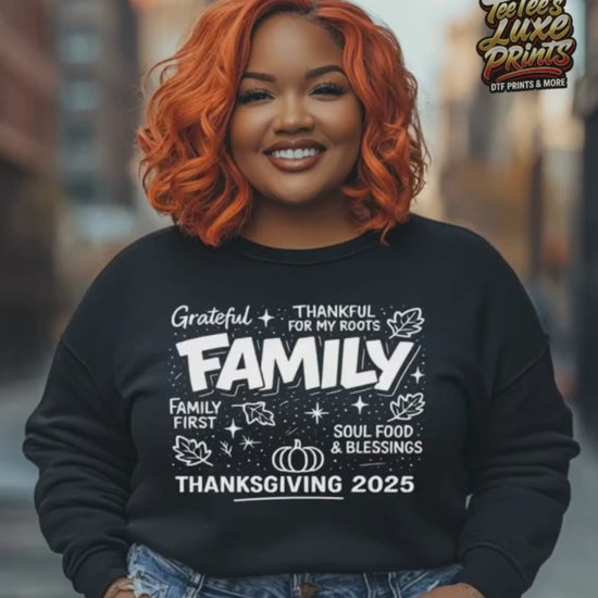 Celebrate the season of gratitude with this Grateful Family Thanksgiving 2025 DTF Transfer. Featuring the uplifting phrases “Thankful for My Roots, Family First, Soul Food & Blessings”, this ready-to-press heat transfer brings warmth and family pride to your fall apparel. Perfect for matching family shirts, Thanksgiving gatherings, and cozy autumn vibes. Designed for easy application on tees, hoodies, and more!